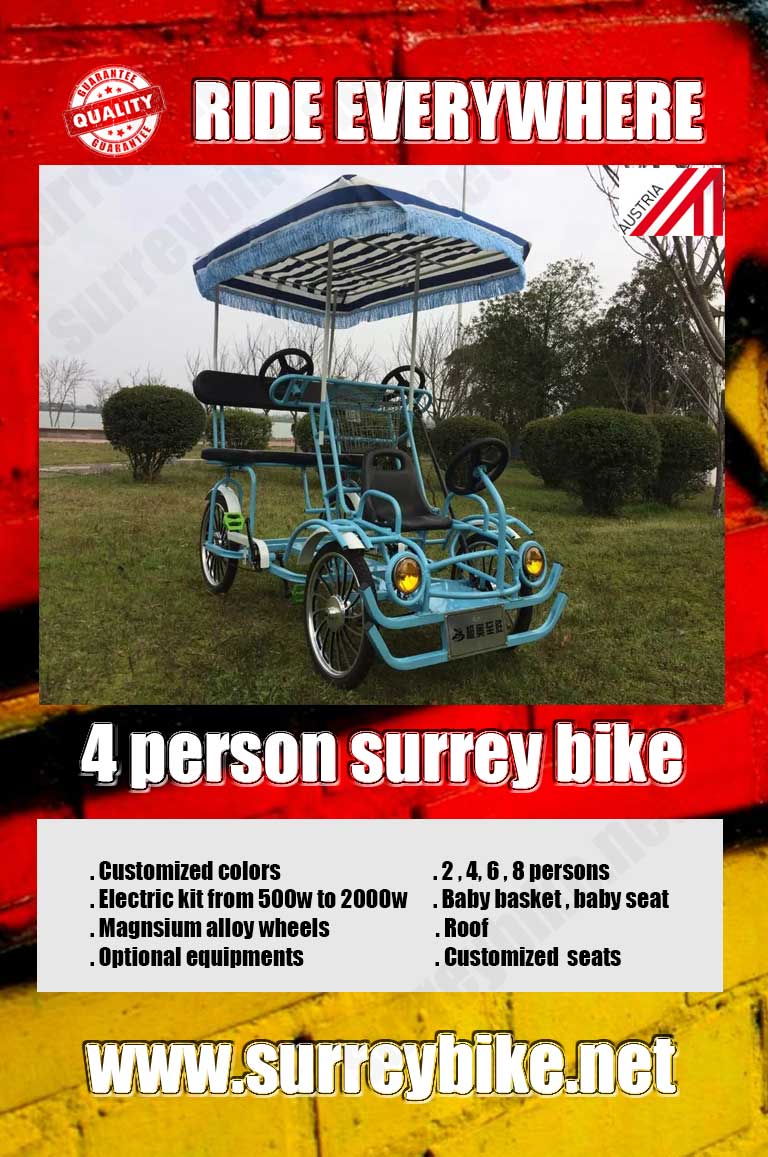 The 8-Person Surrey Bike is a premium group cycle built from high-quality steel with hydraulic steering and coaster brakes for smooth, safe rides. It can be configured as 6-person with a 2-person trailer or 4-person with a 4-person trailer, offering flexible fun for families, resorts, and parks. With weatherproof seats, a sturdy frame, UV-protected canopy, and durable alloy wheels, it ensures comfort, control, and stability on any paved surface. Perfect for shared adventures, this surrey bike delivers long-lasting performance, elegant design, and the ultimate outdoor riding experience for groups seeking joy, togetherness, and eco-friendly transportation.